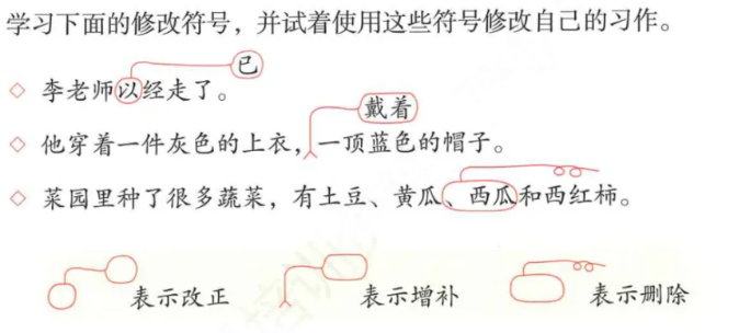 | 删除符号(圈出内容 + 删除线) | 用于删去多余 / 错误内容 | 例句删去 “西瓜”(西瓜属于水果,不属于蔬菜) |