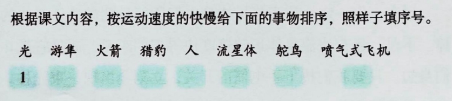 首先对照课文里的速度数据,按 “从快到慢” 排序(题目中 “光” 已标 1): 光 流星体(速度 25 万千米 / 小时) 火箭(速度 4 万千米 / 小时) 喷气式飞机(声速的数倍) 游隼(俯冲>320 千米 / 小时) 猎豹(110 千米 / 小时) 鸵鸟(72 千米 / 小时) 人(24 千米 / 小时) 最终序号对应: 光 流星体 火箭 喷气式飞机 游隼 猎豹 鸵鸟 人 欢迎扫码关注我们的微信公众号
