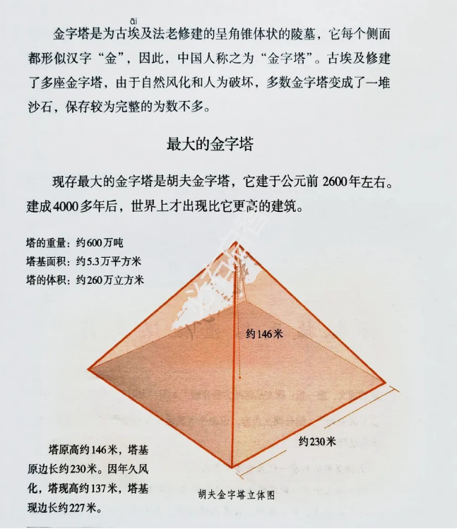 金字塔是为古埃及法老修建的呈角锥状的陵墓,它每个侧面都形似汉字 “金”,因此,中国人称之为 “金字塔”。古埃及修建了多座金字塔,由于自然风化和人为破坏,多数金字塔变成了一堆沙石,保存较为完整的为数不多。